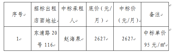 根據(jù)思明區(qū)國有企業(yè)資產(chǎn)出租管理的相關(guān)制度,我公司于2020年12月18日10:00在廈門市禾祥西路51號10A中山房地產(chǎn)公司會議室,進行浦南安置小區(qū)東浦路20號103等13間店面公開招租現(xiàn)場開標(biāo)。僅一間店面成交,其余12間店面因無人應(yīng)標(biāo)而流標(biāo)?,F(xiàn)通過思明控股網(wǎng)站對外發(fā)布成交公告,內(nèi)容如下: