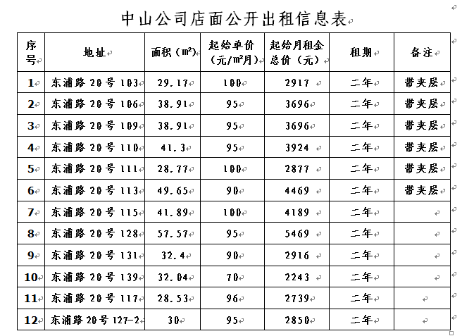 1、擬出租店面地址、建筑面積、租金底價、租賃期限等見下表: