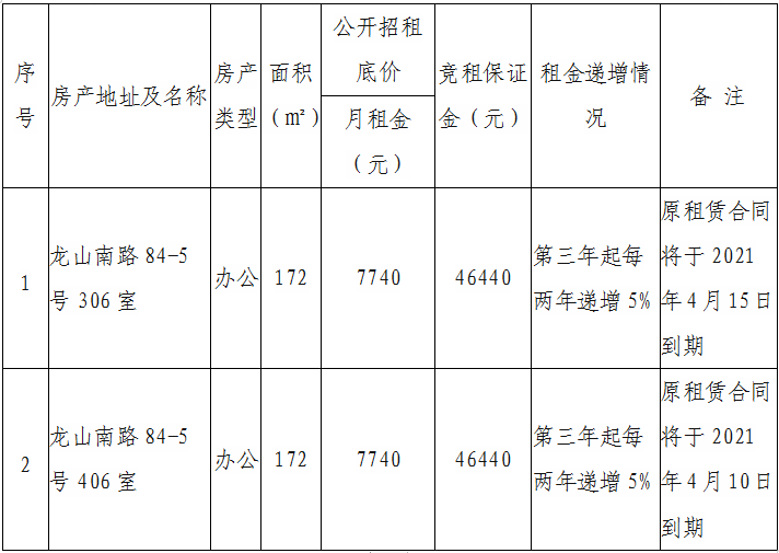 根據(jù)國有企業(yè)資產(chǎn)出租管理相關(guān)制度,我司決定對位于龍山南路84-5號306、406室房產(chǎn)對符合入駐條件的意向承租人進行公開競價招租,具體信息如下: