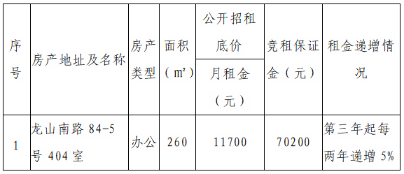 根據(jù)國(guó)有企業(yè)資產(chǎn)出租管理相關(guān)制度,我司決定對(duì)位于龍山南路84-5號(hào)404室房產(chǎn)對(duì)符合入駐條件的意向承租人進(jìn)行公開(kāi)競(jìng)價(jià)招租,具體信息如下: