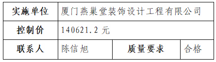 根據(jù)相關(guān)規(guī)定,我司負(fù)責(zé)裝修的園區(qū)服務(wù)大廳、驛站裝修項(xiàng)目直接發(fā)包廈門(mén)燕巢堂裝飾設(shè)計(jì)工程有限公司實(shí)施,現(xiàn)于2022年1月14日至2022年1月18日對(duì)外發(fā)布結(jié)果公告,內(nèi)容如下: