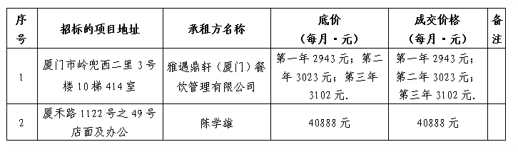 根據(jù)思明區(qū)國有企業(yè)資產(chǎn)出租管理的相關(guān)制度,我司2022年1月25日上午9:00起于廈門市前埔工業(yè)園1號(hào)全和公司七樓會(huì)議室進(jìn)行公開招租現(xiàn)場開標(biāo),現(xiàn)通過思明控股網(wǎng)站對(duì)外發(fā)布成交公告,內(nèi)容如下: