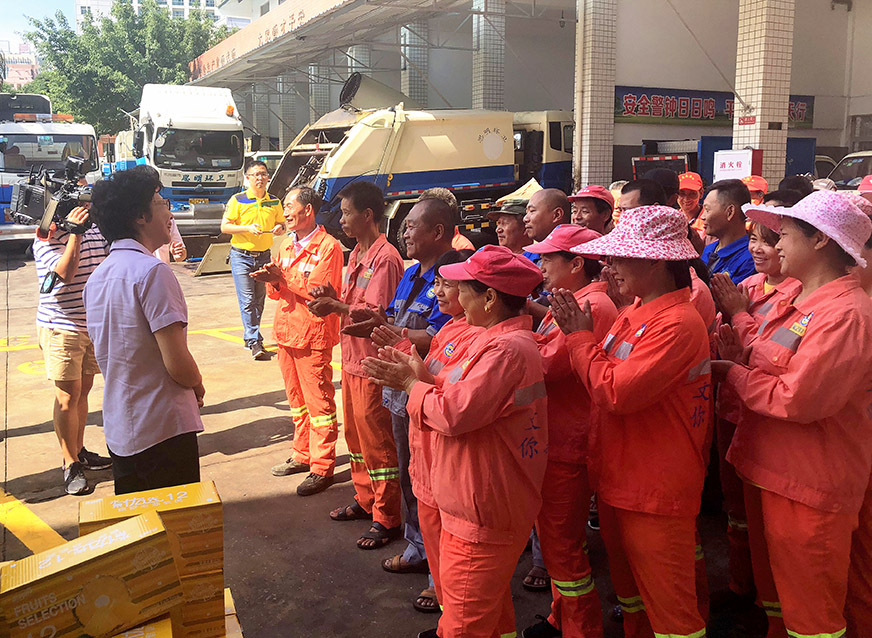 7月4日上午,廈門市委常委、市總工會(huì)主席倪超一行到思環(huán)公司洪文車場慰問環(huán)衛(wèi)工人,為戰(zhàn)酷暑的工人送去防暑降溫藥品、飲料,送去深情問候。